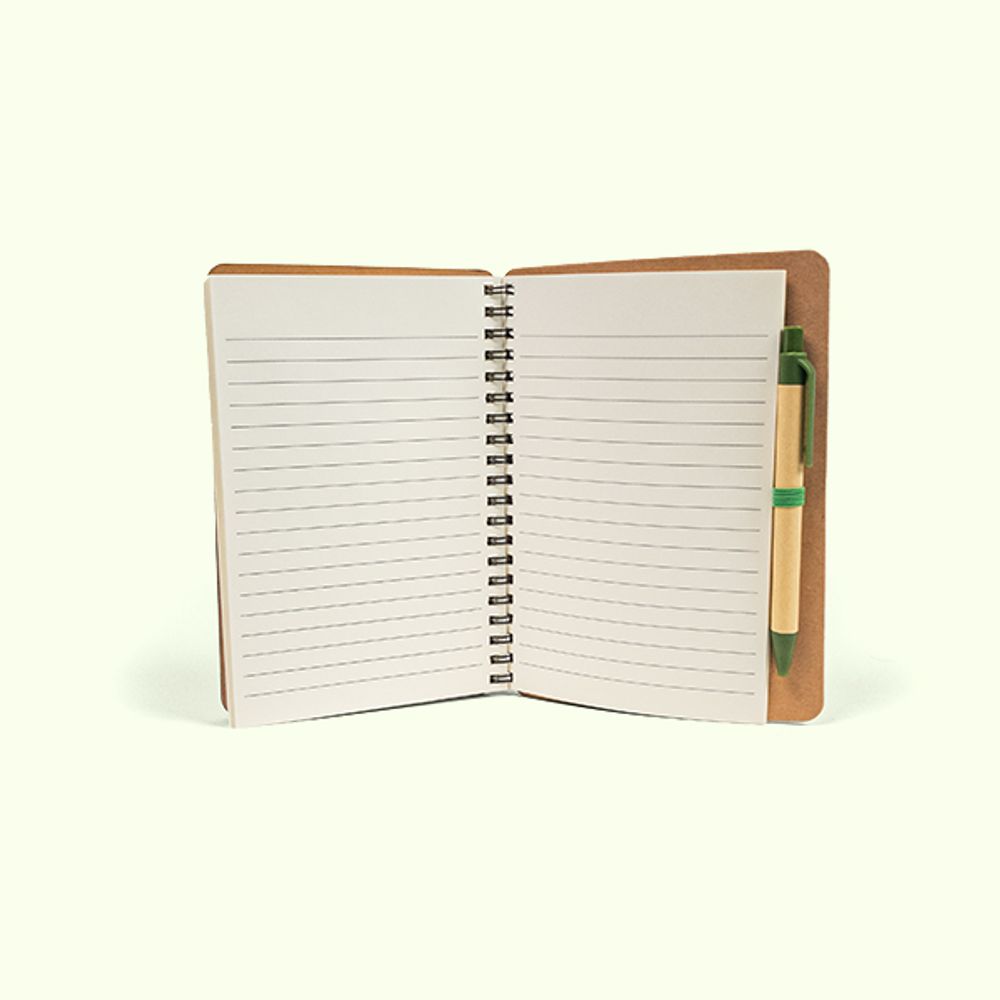 The 5'' x 7'' FSC® Mix Eco Spiral Notebook with Pen features 60 ruled sheets of FSC® Mix cream paper, has a matching color elastic pen loop, and comes with a matching color ballpoint pen. Please note that pens are packed separately from notebooks. Through a partnership with 1% For The Planet, one percent of sales of all EcoSmart® products are donated to environmental nonprofits. Due to the nature of the material, there may be color variances.